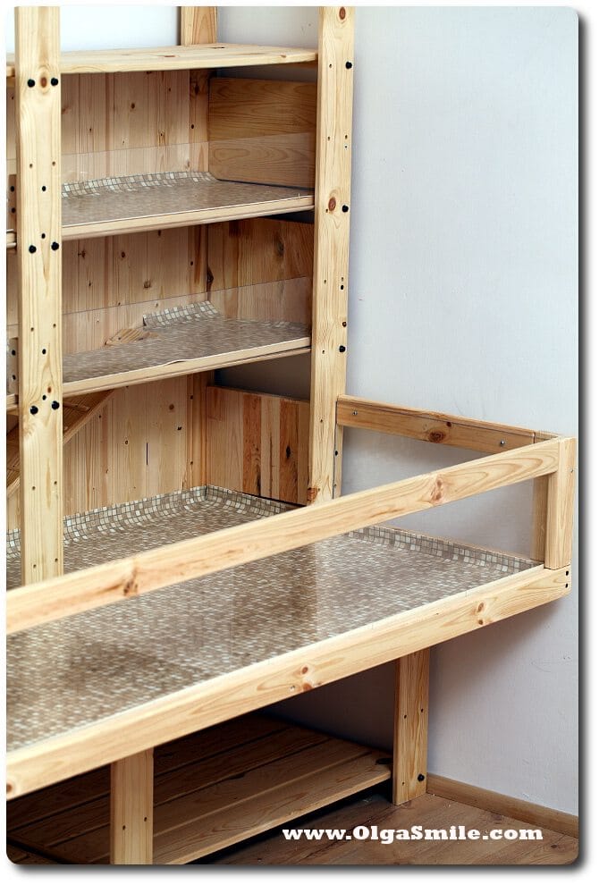 Мы использовали две полки, чтобы подготовить такой дом ИКЕА Горм один в глубину 55 см, а другой в 35 см. Пять мебельных щитов шириной 50 х100 см. Почти два листа плексигласа 150 × 50 см, пакет вагонки, дюжина или около того планок и планок, шурупов и почти 200 × 200 см ПВХ настила. Я купил несколько пластиковых контейнеров для чипсов, пеллет, сена и припасов для листьев, трав и кормов. Они стоят под книжной полкой (те, которые используются чаще) и на книжной полке.